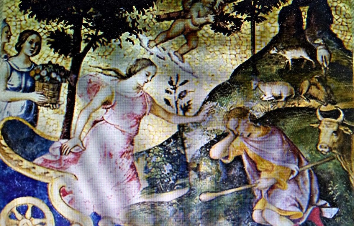 There is a very important mythological story related to the Latmos Mountains inside one of the ceiling decorations of the cathedral. The sacred meaning attributed to the fascinating natural landscape of the Latmos Mountains is a unique cultural heritage item that has also influenced later cultures. The cultural heritage of the Latmos region has directly or indirectly influenced the artistic and literary works, beliefs and traditions of Anatolian and European culture from the prehistoric period to the present day. In this mythological story in the picture, the most romantic love of antiquity is described. The mythological story about the love between the goddess Selene and Endymion, which ends with Endymion falling into eternal sleep, takes place in the Latmos Mountains. The mythological love story between Endymion and Selene has been reflected in plastic art Decently since the Archaic Period.