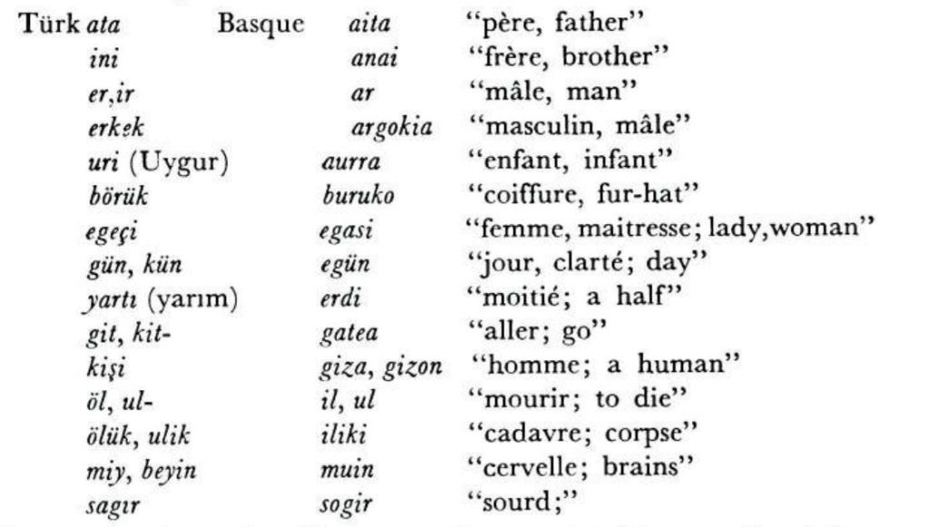 Basklar Asya kökenli bir kavimdir. Onların Türklerle temasları çok eski olup bu temas değişik bölgelerde ve birden fazla gerçekleşmiştir. Basklar en son Volga (İdil) bölgesindeki Türkler ile temas etmişler ve yaklaşık olarak 1700 seneden beri de bu temas kesilmiştir.