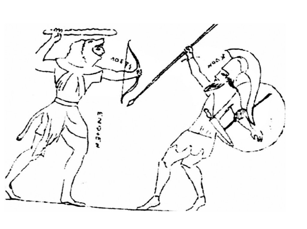 Aşağıdaki resimde iki askerden yenen yenilene “enkten” diye haykırıyor. Bu söz eski Türk dilindeki “engdin” «şaşırdım» ile aynı bir sözdür. Yenen askerin yenilene «şaşırdın!» diye haykırması tamamıyla mantıksaldır.