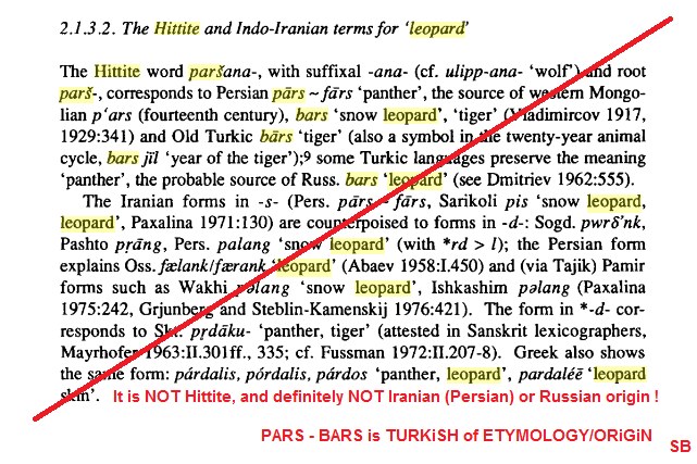 Pars/Bars Türkçe kökenli bir sözcüktür. “Hint-Avrupacıların” iddia ettiği gibi ne Hititçedir, ne Persçe ne de Rusçadır. Hitit yazıtlarında görülen PARSANA kesinlikle Türkçeden geçmedir.