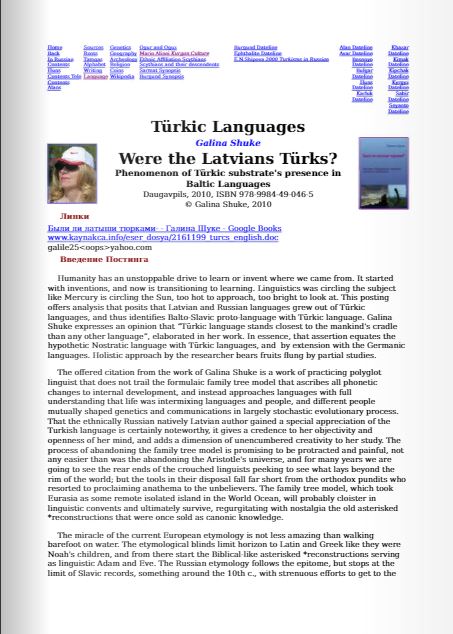 G. Shuke, Letonya’da Türkçe-Letonca dili bağlantısını incelediği bir kitap yayımladı. Rus kökenli olan yazar bu ülkede birçok yer adının Türkçe bağlantılı olmakla kalmayıp dillerindeki kelime ve yapıya bakarak Litvanyalıların Türklerle binlerce yıl öncesinde kök dil zamanındanbağlantısını ortaya koymaktadır. Bunlara kelime sonlarına gelmekte olan takı yapısı da dahildir. Hatta Rusçayı da içinde barındırdığı binlerce Türkçe sözcükle bu kapsama katmaktadır. Bu çerçevede yaptığı değerlendirme sonucu “Türkçe, insanlığın beşiğindeki kök dile en yakın olandır” demektedir. ‘’…Tarihsel kaynaklardan Avrupa’da çok farklı etnik grupların olduğunu biliyoruz. Bilim adamları Kimmerler , İskitler ve Sarmatlar’ın bugün Avrupa’da yaşayan Türk soylu kabileler olduğunu teyid ediyorlar.” (Zakiev/Закиев, 2002).